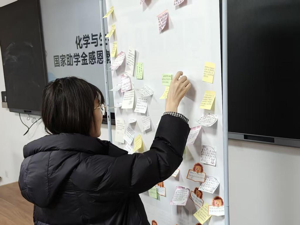 国家助学金不止于“一次帮扶”,更像是一束照亮青春的光,为了化生学子卸下求学包袱,让他们能潜心钻研试管反应、细究显微镜下的奥秘,在专业领域深耕不辍,也将受助的感动化为奋进的力量,课堂上的专注、实验室里的攻坚,都是学子们用扎实成长回应期许的证明。活动中的“感恩墙”不仅是满墙真挚寄语,更成了彼此砥砺前行的精神坐标。